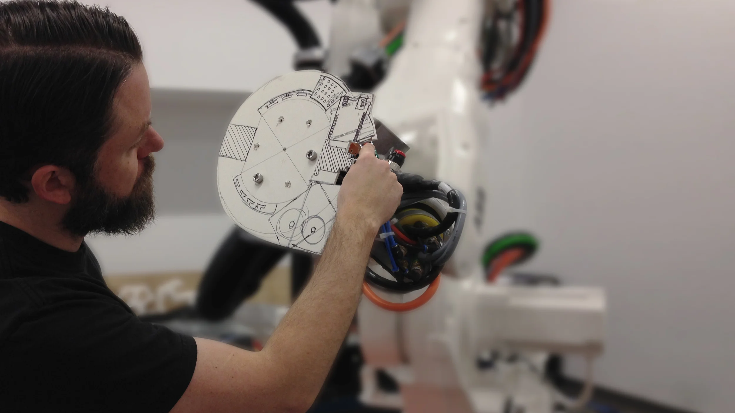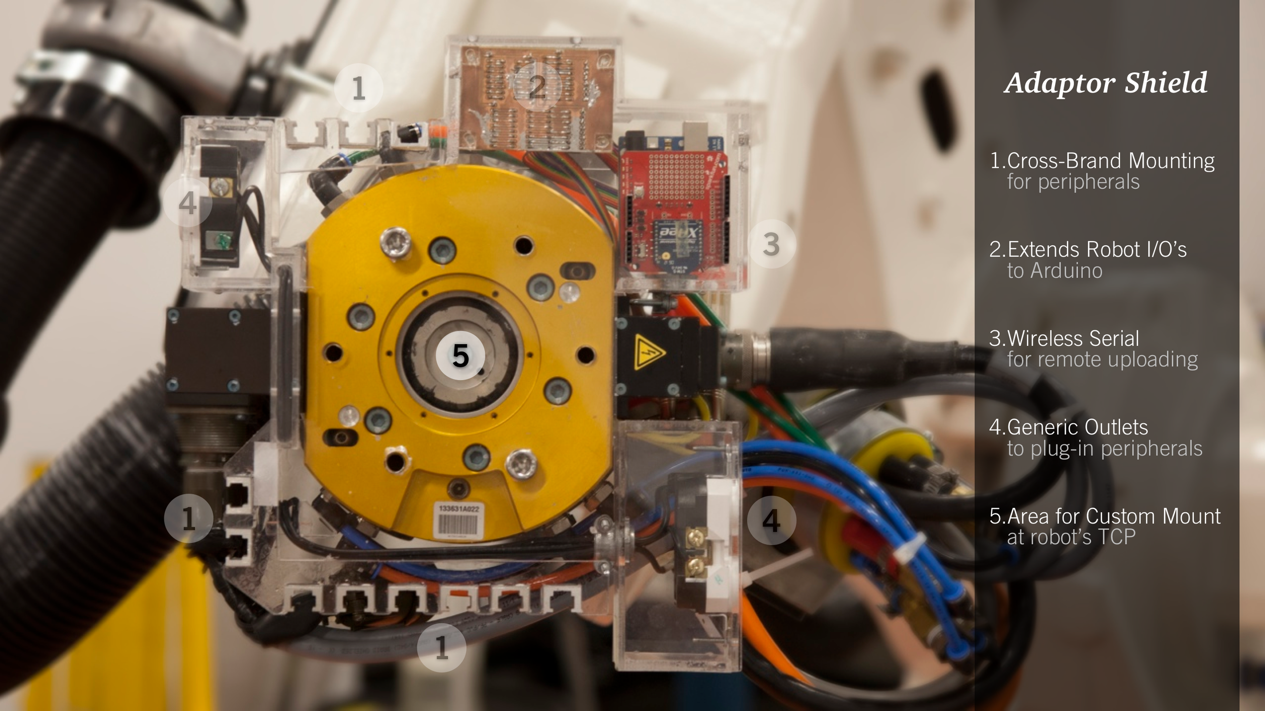 With these goals outlined, our first steps were to prototype a universal adaptor plate for the end of the robot. This adaptor plate is designed to be a modular, open hardware platform that (a) integrates existing physical computing platforms (e.g., Arduino and RedBoard) and (b) creates a common baseline for prototyping smart tools for any industrial robot.