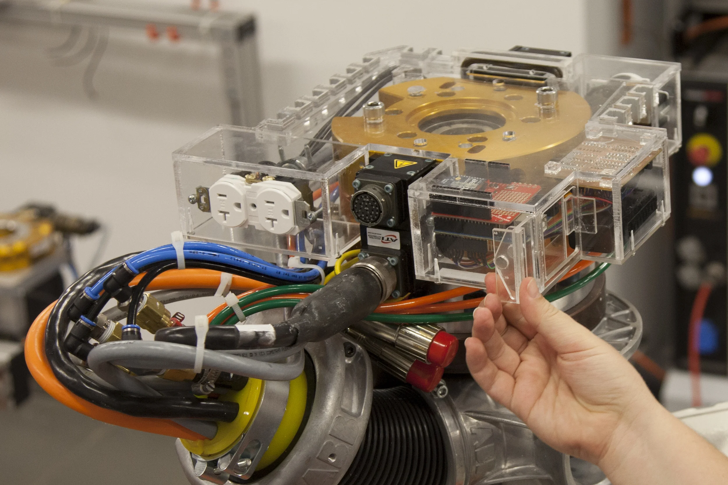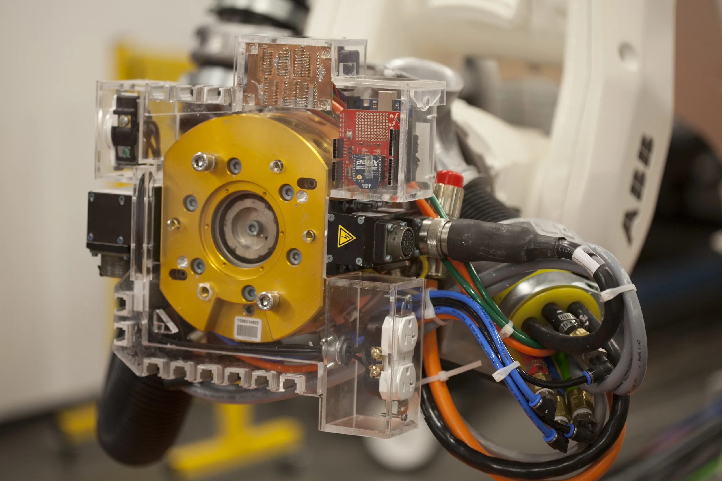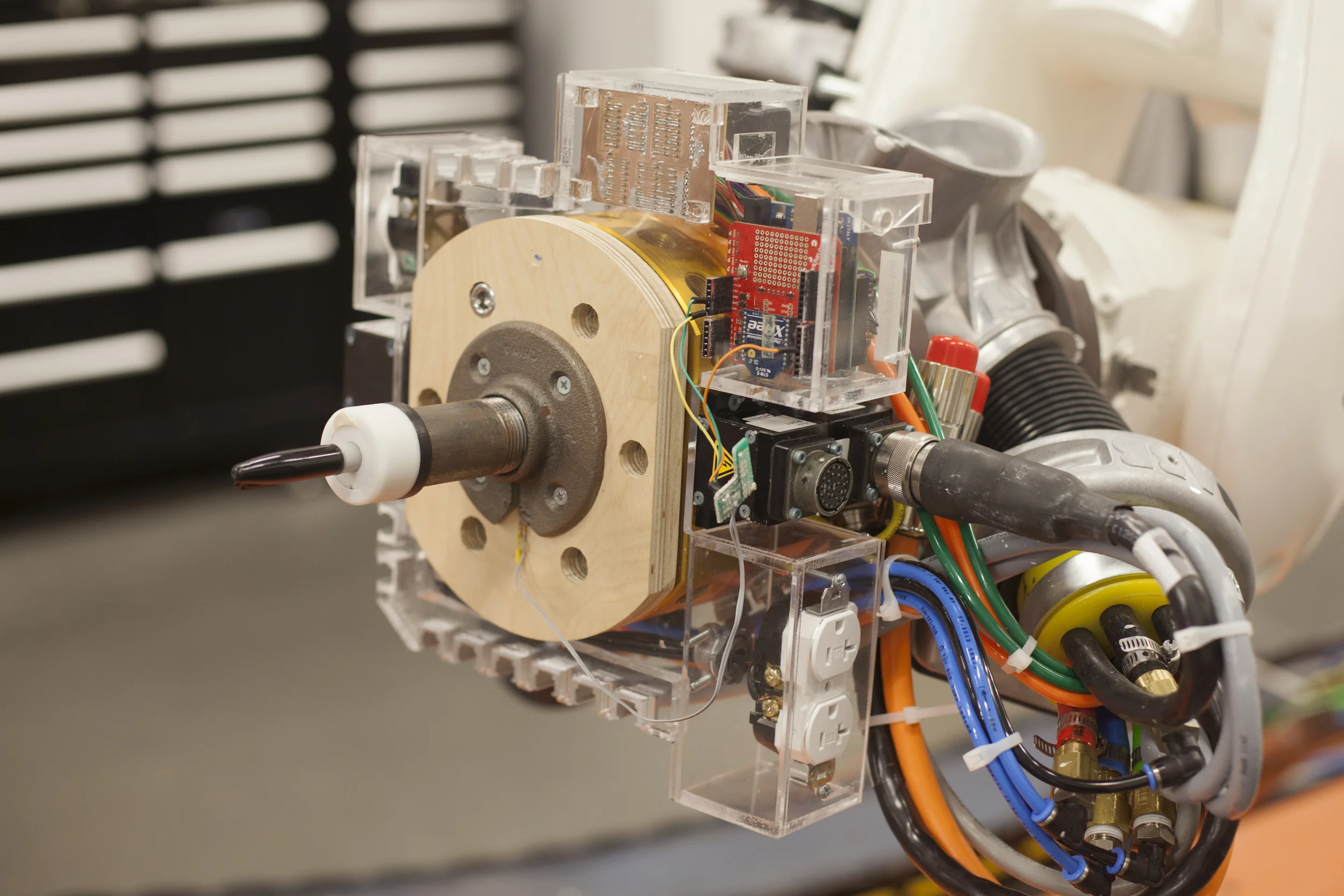 The RTA irons out a number of small, but cumbersome, hurdles that everyone deals with when working with IRs beyond their basic use. For example, power is often the last thing you think of when designing a custom end-effector: if you want to put motors, micro-controllers, cameras, or projectors on the end of the robot arm, how do you actually get power to these devices? You used to need a battery big enough or an extension cord long enough to run your tool. But this is inefficient and sometimes hazardous in the working area. The RTA routes normal 120V power from the robot into generic power outlets mounted right at the end of the arm. This lets you just plug-in your device and power it directly from the robot. Similarly, the on-board micro-controller is powered directly from the robot – so there's no more need to follow two steps behind your robot with a USB cord connecting your laptop to your arduino!