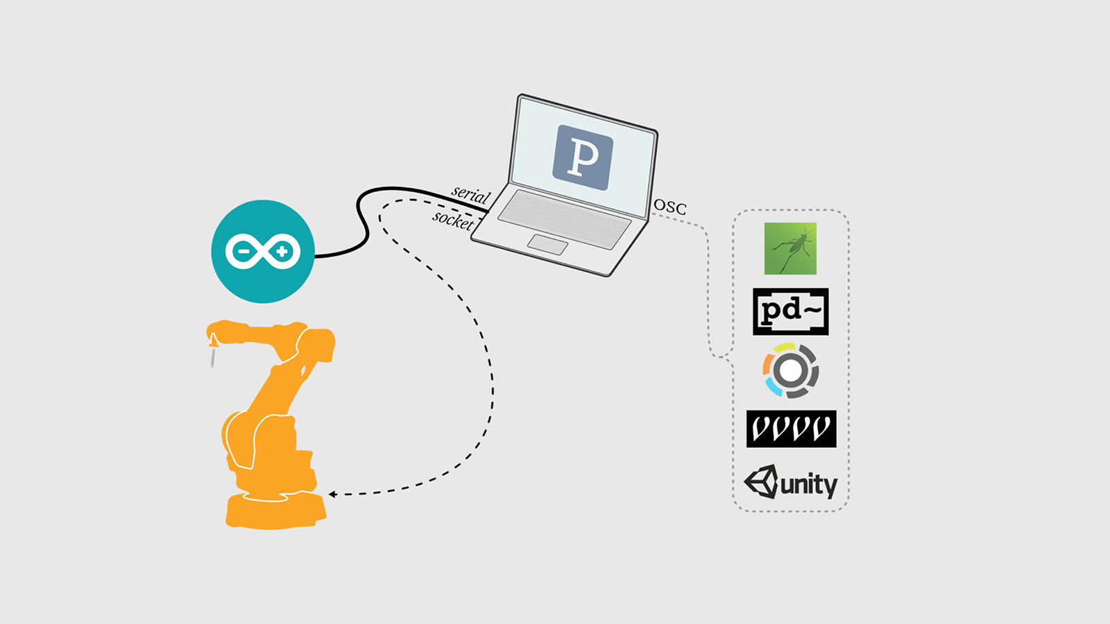 The processing interface, in addition to making live-control and cross-platform programming possible, also integrates other communication channels. For example, it integrates serial communication for connecting to the microcontroller on the RTA over Xbee. It also integrates Andreas Schlegel's oscP5 library to connect other software environments, such as Grasshopper3D, Pure Data, MAX/MSP, VVVV, or Unity, to an IR. This lets our Processing interface act as a gateway for interactive software environments, not usually associated with industrial robotics, to begin to play in the same sandbox.