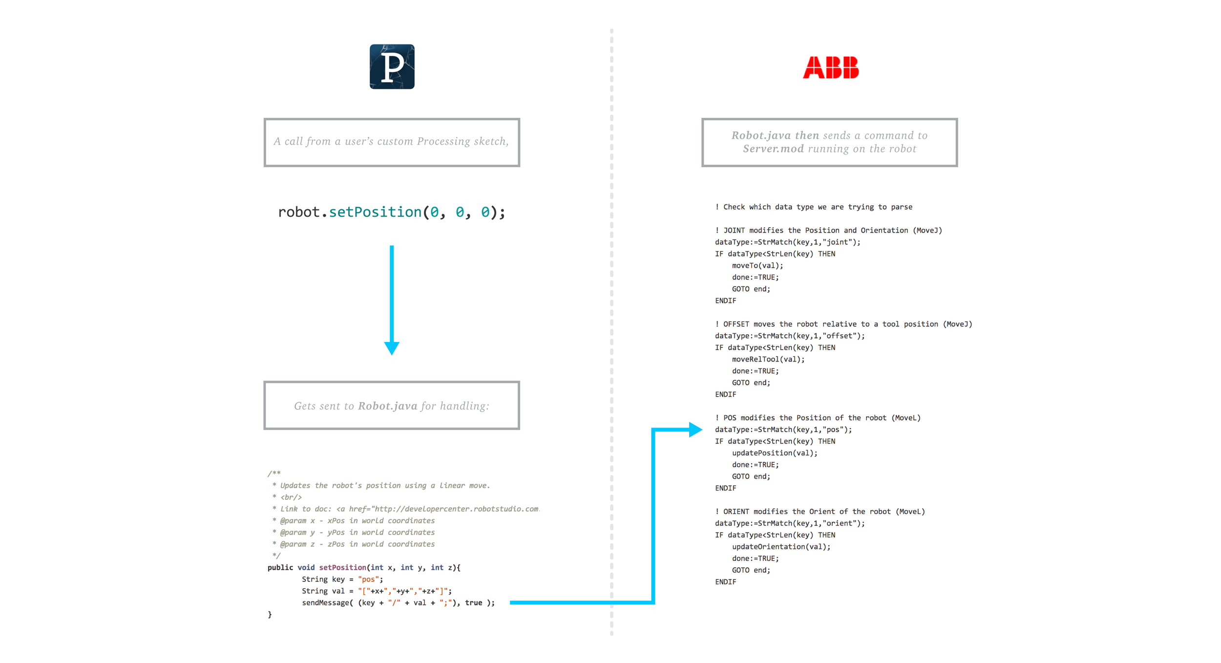 The diagram below breaks down the structure for sending a command from a user's processing sketch to an IR running the server program. The basic idea behind the design of the code is for the generic server program running on the robot (Server.mod) to just parse and handle key-value strings sent from the class, Robot.java. These key-value strings lets the processing interface remain modular and independent from a proprietary machine language of an IR brand. For example, to adapt our processing interface from an ABB robot to a KUKA robot, you don't need to modify any processing code; you just need to format the Server.mod file for KUKA's language. This means that a Processing sketch developed on an ABB robot should also work on a KUKA.