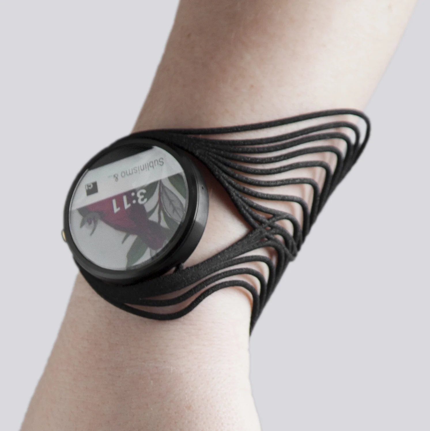 In this example, we use Tactum to create a new watch band for the Moto 360 Smartwatch. Skin gestures enable the designer to set the position and orientation of the watch face on the wrist and to craft the overall form. However, there are a number of hard constraints that need to be extremely precise in order for the watch face to fit, and the new band to function. For example, the clips to hold the watch face and the clasp to close the band onto the arm have exact measurements and tolerances required for both fit and fabrication.