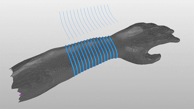 Pre-scanning the body is not entirely necessary when designing a wearable in Tactum. However, it ensures an exact fit once the printed form is placed back on the body. Between the 3D scan, the intelligent geometry, and intuitive interactions, Tactum is able to coordinate imprecise skin-based gestures to create very precise designs around very precise forms.